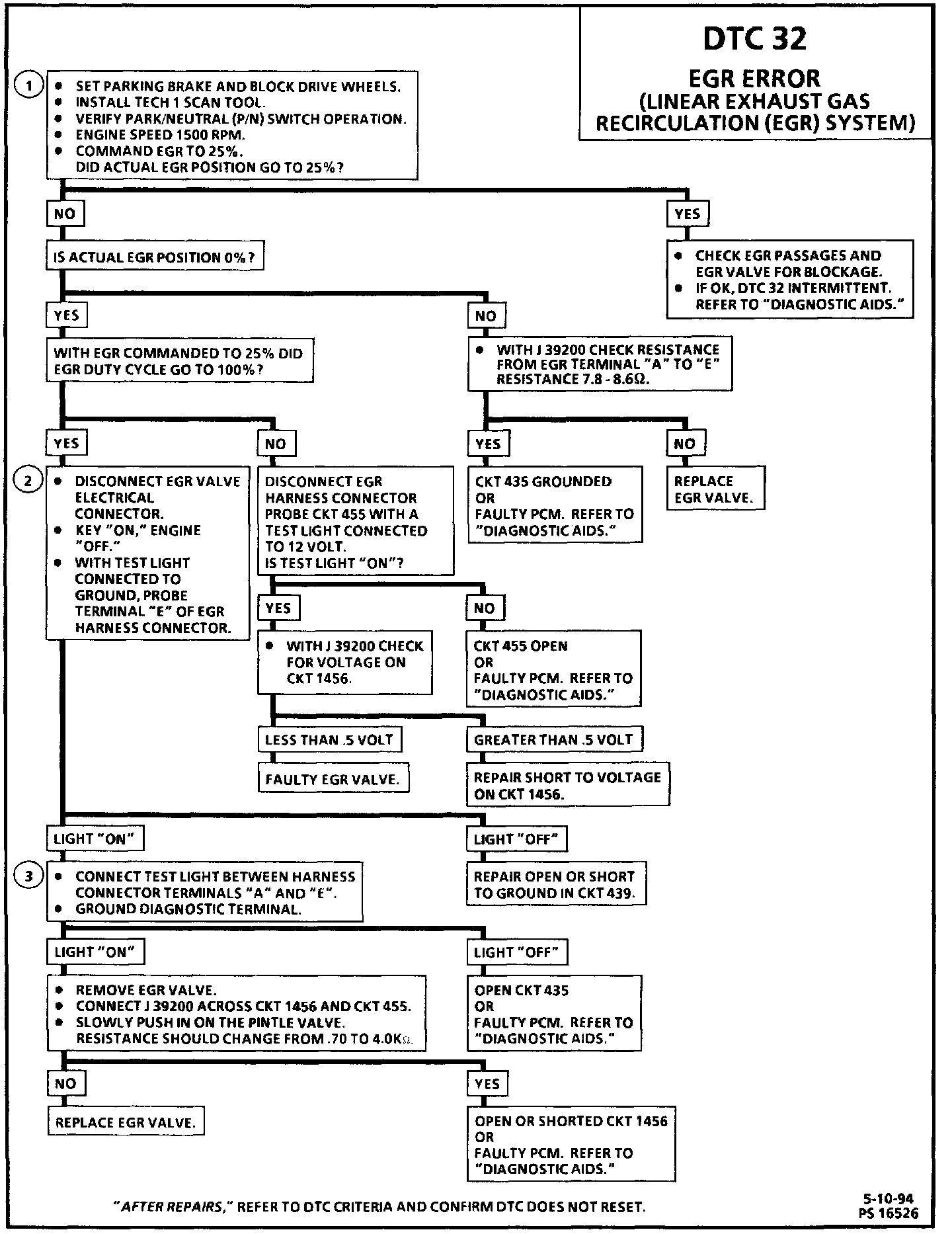 The PCM monitors EGR effectiveness by de-energizing the EGR control, thereby, shutting "OFF" the EGR valve. With the EGR valve closed, and Oxygen Sensor (O2S) fluctuating normally, fuel integrator counts will be greater than they were during normal EGR operation. If the change is not within the calibrated window, after failing the test twice, a DTC 32 will be set.