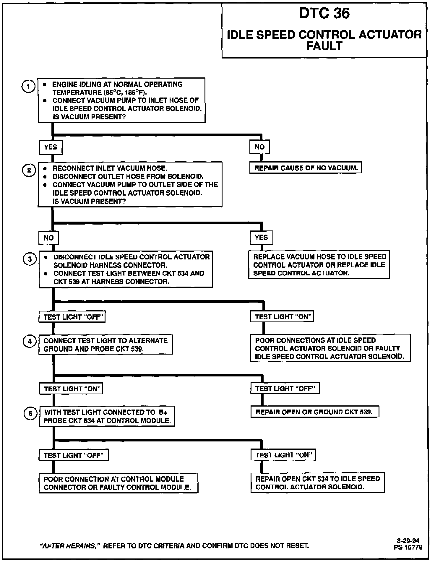 If Barometric Pressure Sensor (BARO) is below 68 kPa (9.8 psi.) a 96 second reset will result. If DTC 36 sets, a DTC 35 will usually also set. Repair the DTC 36 first, clear DTCs and recheck for DTCs. If IAC is at 0 counts, the idle speed control actuator will disengage and raise idle speed.