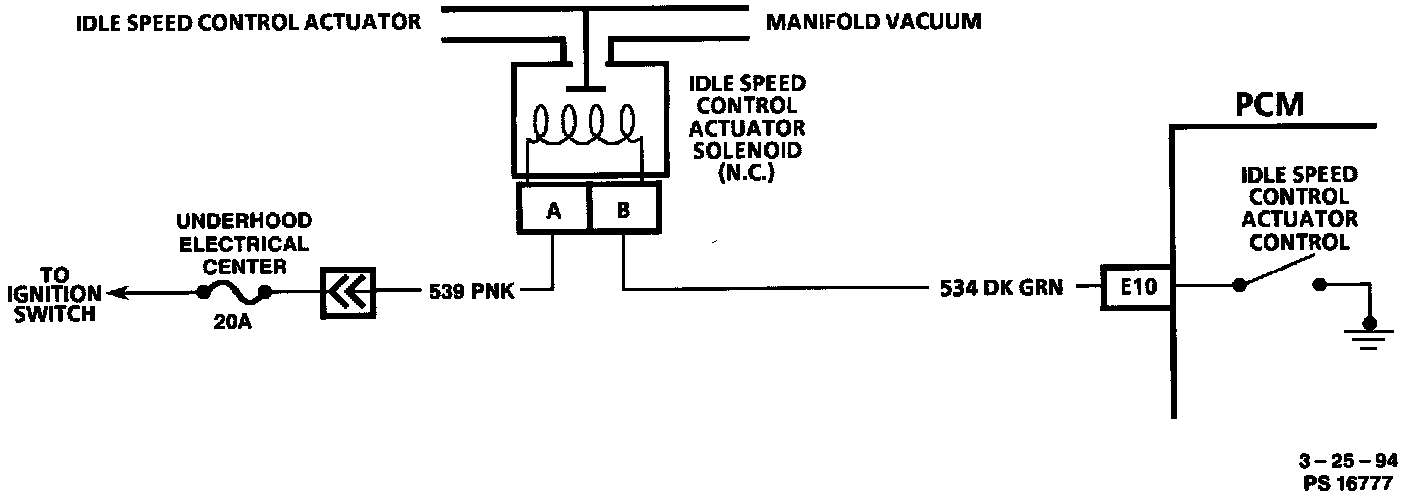 3. Checks for power to the solenoid, the ground circuit, the connections at the idle speed control actuator solenoid and the solenoid itself.