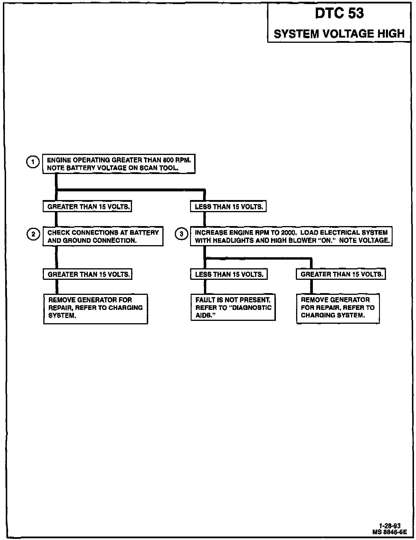 Charging battery with a battery charger and jump-starting engine may set DTC 53. If diagnostic trouble code sets when an accessory is operated, check for poor connections or excessive current draw. Also, check for poor connections at starter solenoid or fusible link.