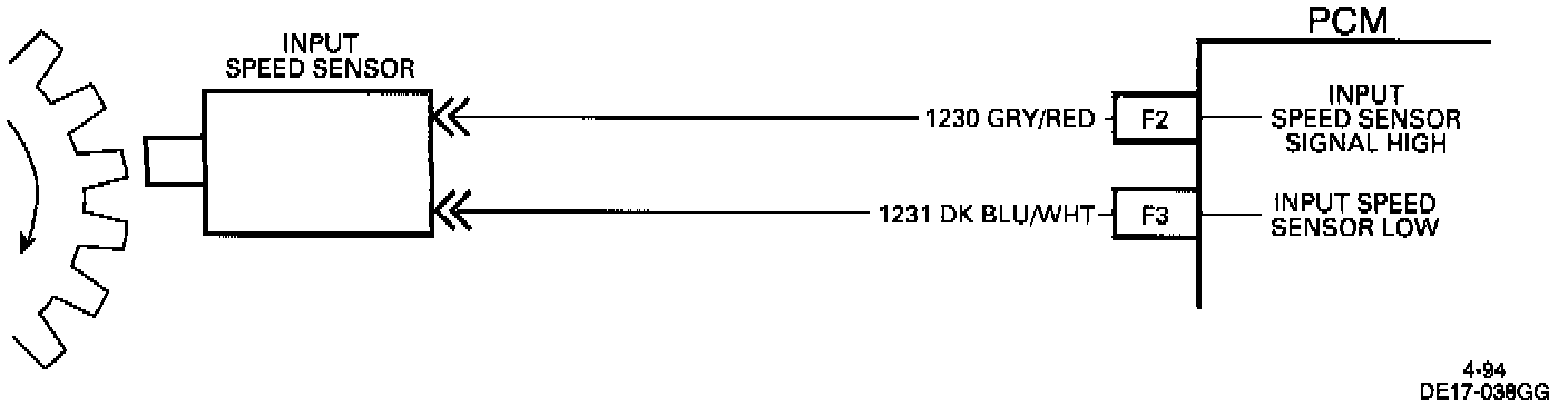 The Transmission Input Sensor (TIS) sensor consists of a permanent magnet surrounded by a coil of wire. As the forward clutch housing rotates, an AC voltage is induced in the circuit. The signal voltage and frequency vary directly with the forward clutch rotational speed.