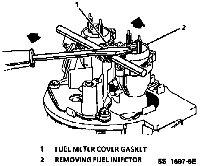 3. With fuel meter cover gasket in place to prevent damage to casting, use a screwdriver and fulcrum to carefully lift out each injector.