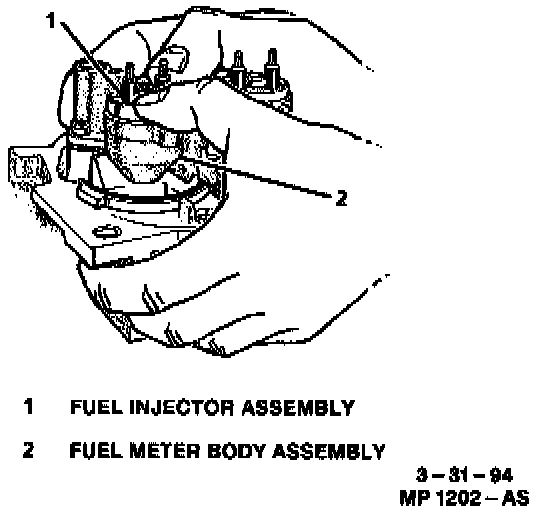 4. Injector, aligning raised lug on each injector base with notch in fuel meter body cavity. Push down on injector until it is fully seated in fuel meter body. (Electrical terminals of injector should be parallel with throttle shaft.)
