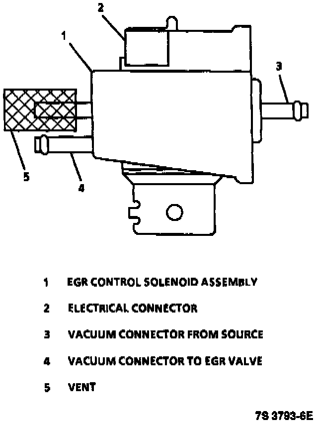 To regulate EGR flow a control module controlled solenoid is used in the vacuum line. This is a normally closed solenoid vacuum valve which is opened when the control module completes the ground. The control module will energize the EGR solenoid (EGR ON) when the engine is warm and above idle. There is little EGR flow at wide open throttle due to lack of engine vacuum.