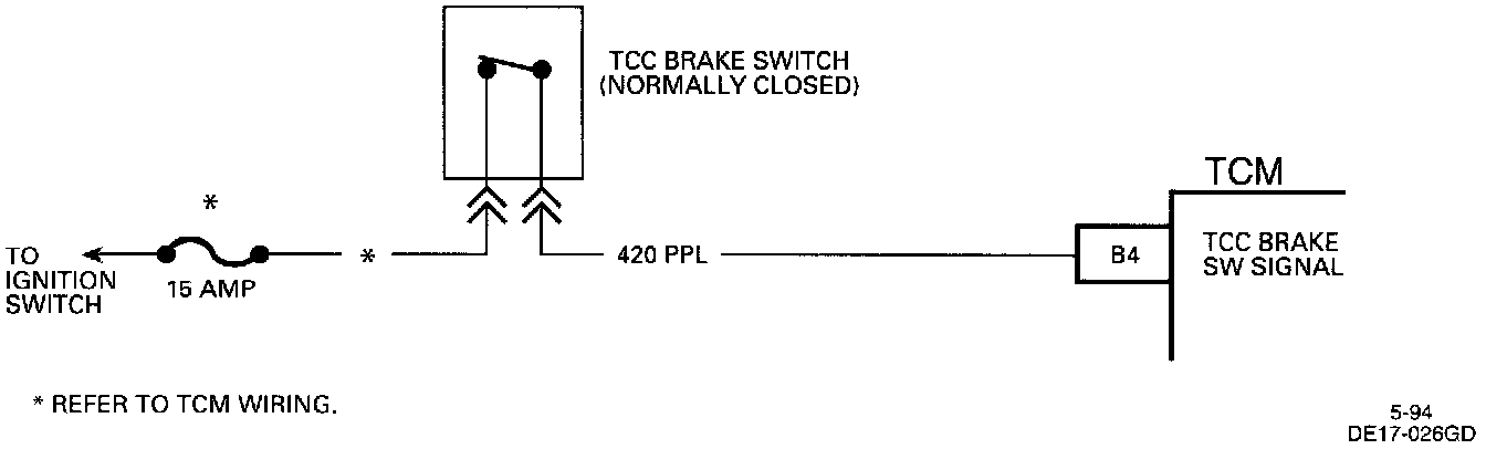 The normally closed brake switch supplies a B+ signal on CKT 420 to the Transmission Control Module (TCM). The signal voltage drops to 0 volt when the Torque Converter Clutch (TCC) brake switch is opened (brake pedal applied).