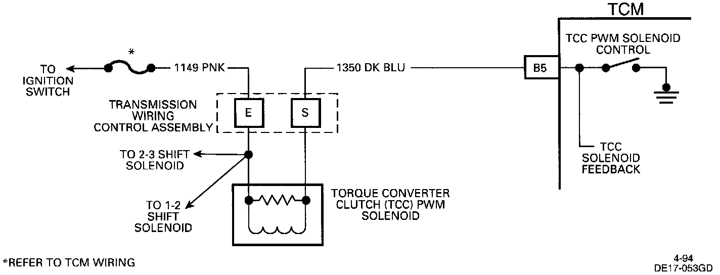 ^ The Transmission Control Module (TCM) commands the solenoid "ON" and voltage remains high (B+).