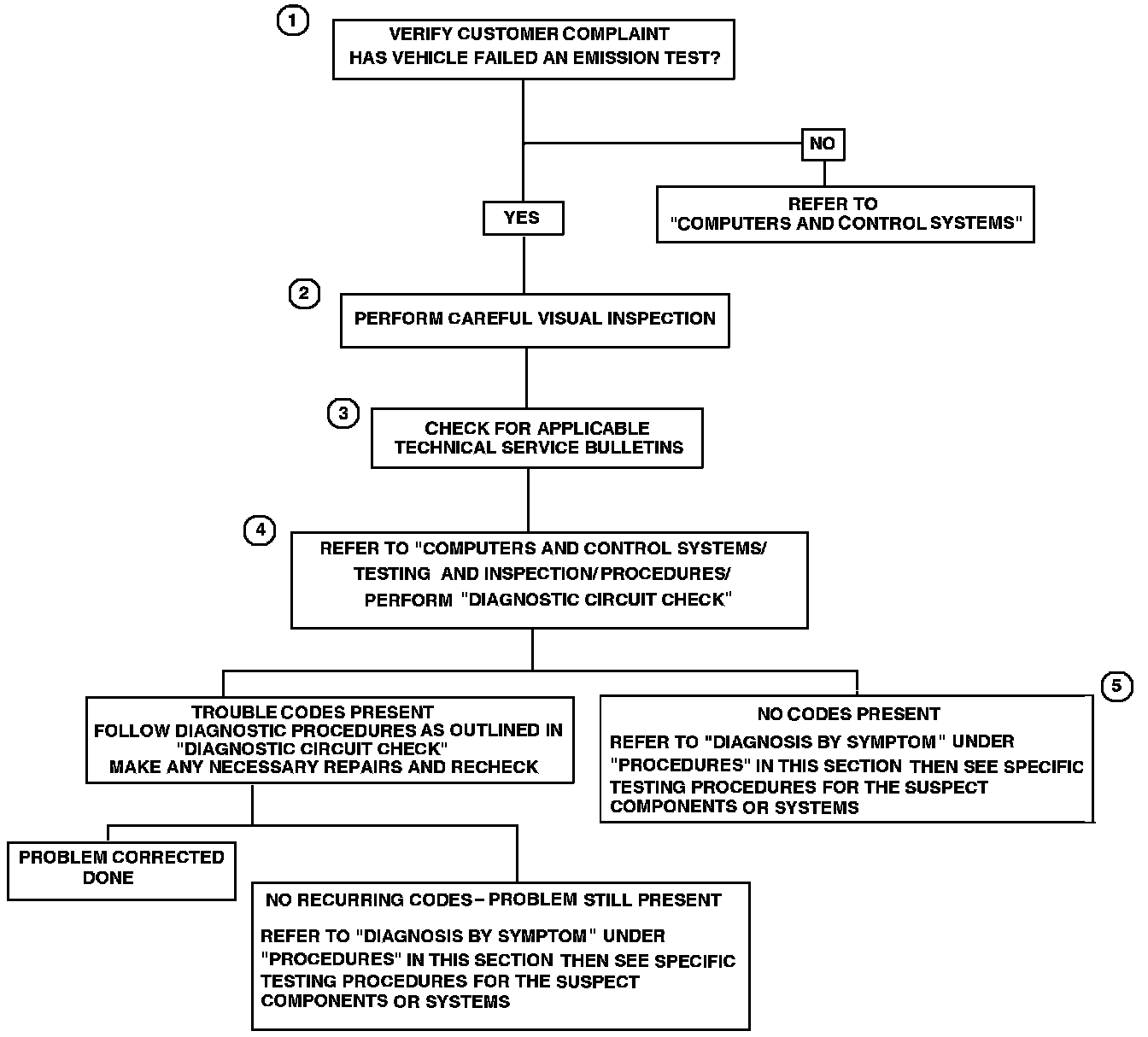 4. Before trying to diagnose a possible emission control system problem, the computer controls must be verified to be operating properly and any trouble codes present should be addressed first.