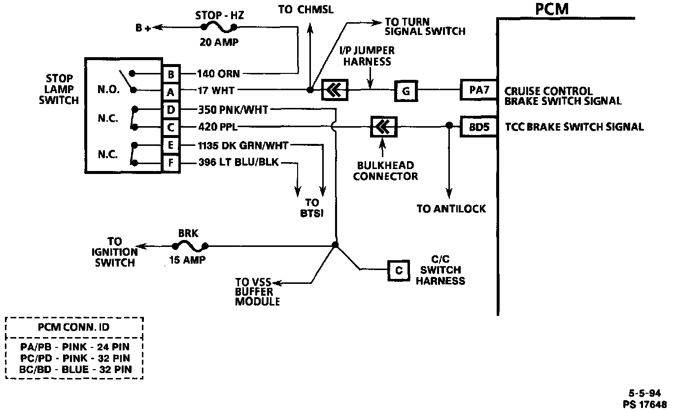 The stop lamp/cruise control normally open brake switch supplies a B+ signal on CKT 820 to the PCM when the brake is applied.