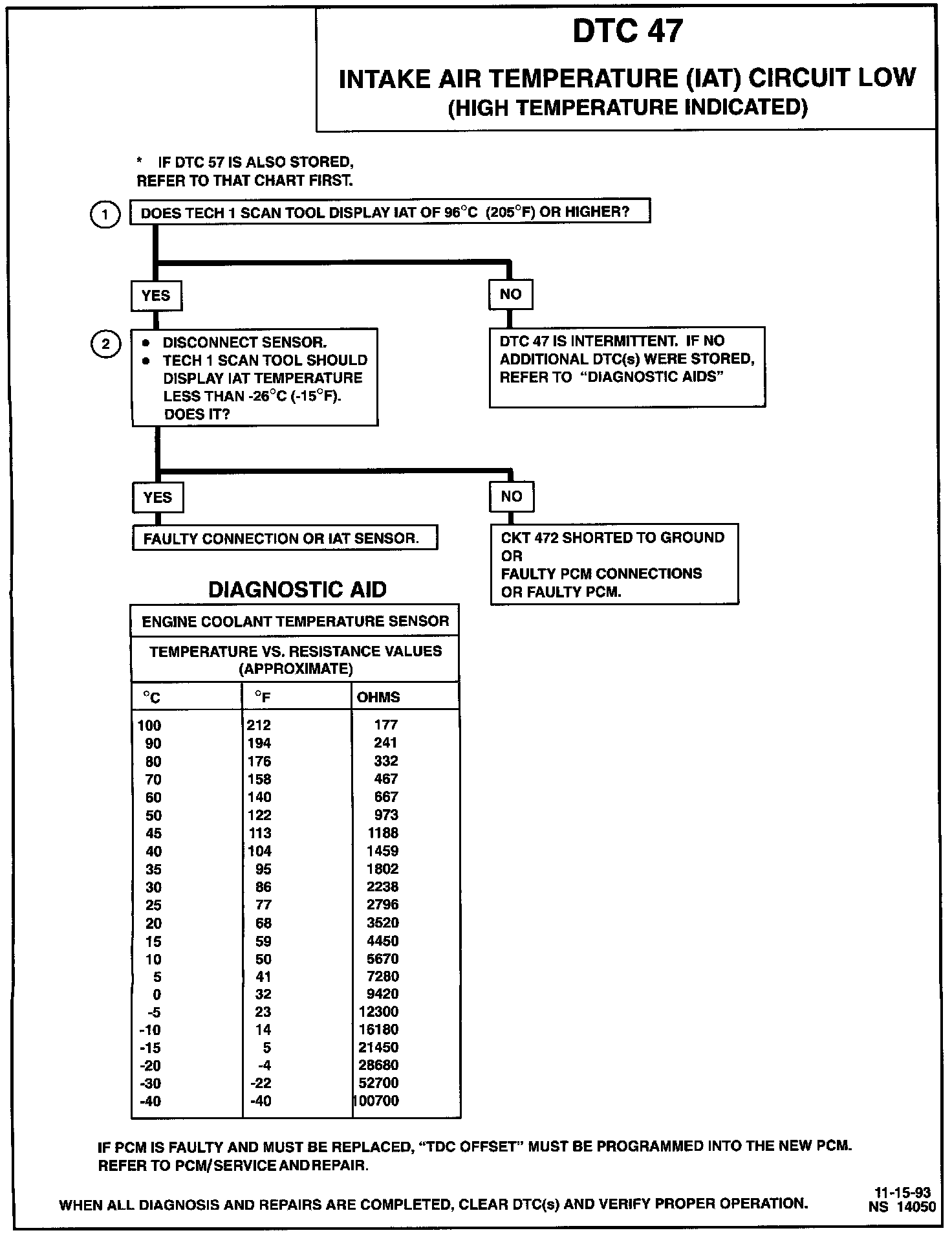 Tech 1 scan tool displays intake air temperature in degree centigrade. A faulty connection or an open in CKTs 452 and 472 will result in a DTC 47.