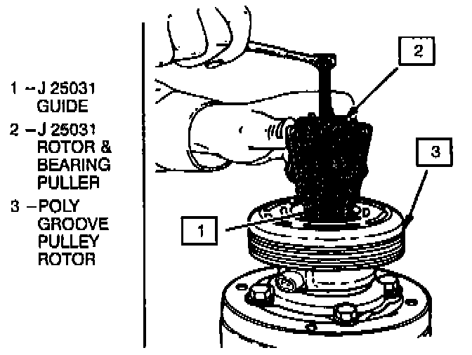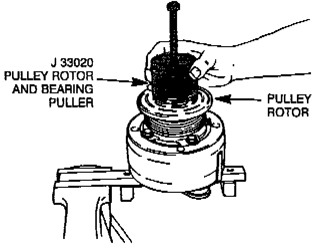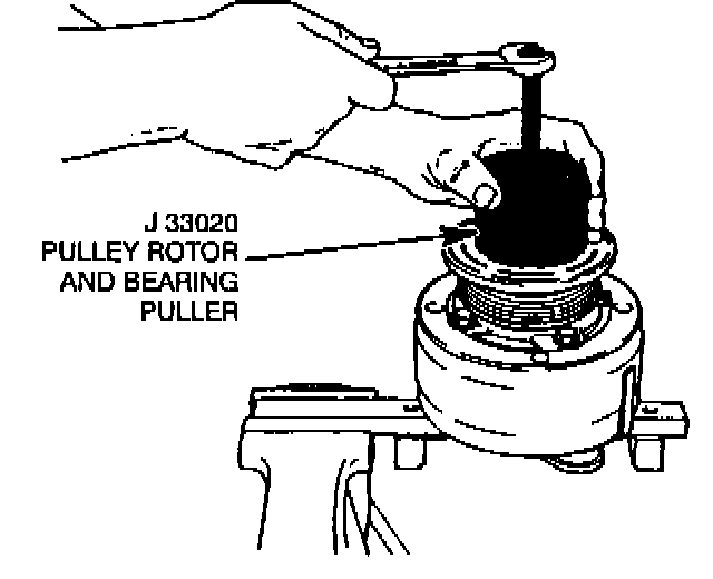 4. Hold the J 33020 Puller in place and tighten the puller screw against the Puller Guide to remove the pulley rotor and bearing assembly.