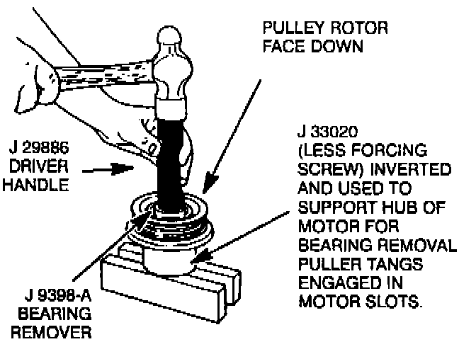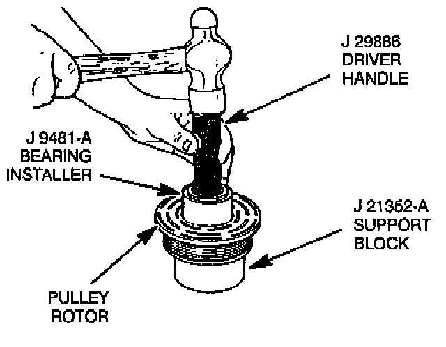 5. To prevent damage to the pulley rotor during bearing removal, the rotor hub must be properly supported.