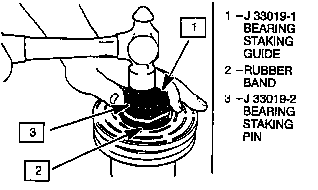 3. Place Bearing Staking Guide J 33019-1 and Bearing Staking Pin J 33019-2 in the hub bore as shown in the illustration. Shift the rotor and bearing assembly on the J 21352-A Support Block to give full support of the hub under the staking pin location. A heavy duty rubber band may be used to hold the stake pin in the guide, and the stake pin should be properly positioned in the guide after each impact on the pin.