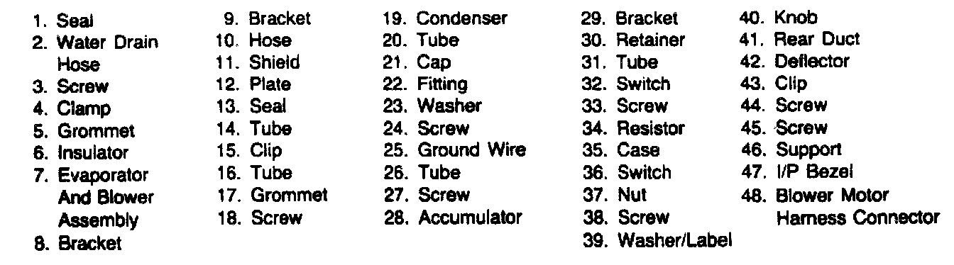 6. Evaporator and blower assembly support-to-roof rail screws (45) (figure 1).