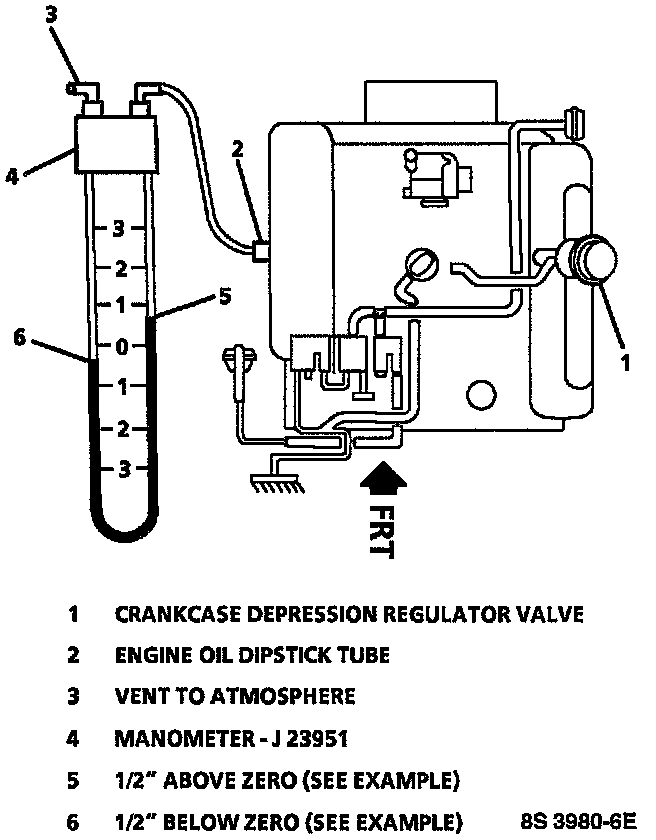 1. Connect one end of the manometer to the engine oil dipstick hole. The other end of the manometer is vented to atmosphere.