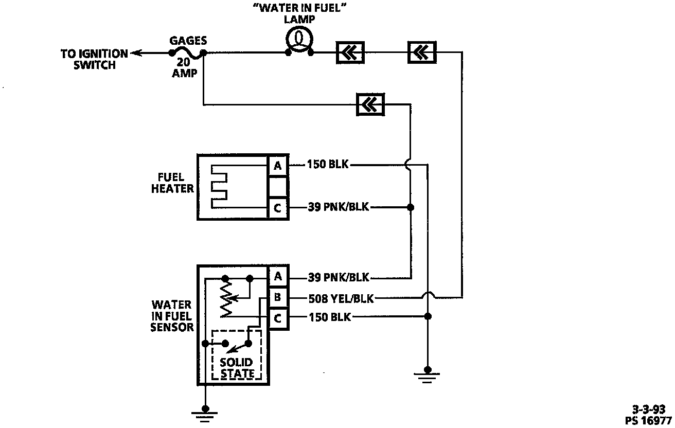 The solid-state water in fuel sensor supplies voltage to a probe. When the probe touches water, the module closes a switch. This completes a circuit to ground to light the "Water in Fuel" lamp.