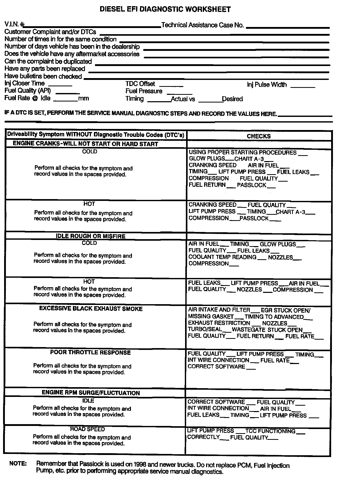 2. Complete the entire Diesel EFI Diagnostic Worksheet by recording the values of the diagnostics performed (Attachment 1). Photocopy the Diagnostic Worksheet form and attach to the repair order hard copy. If core return is requested, the repair order and diagnostic sheet must be returned with the core.