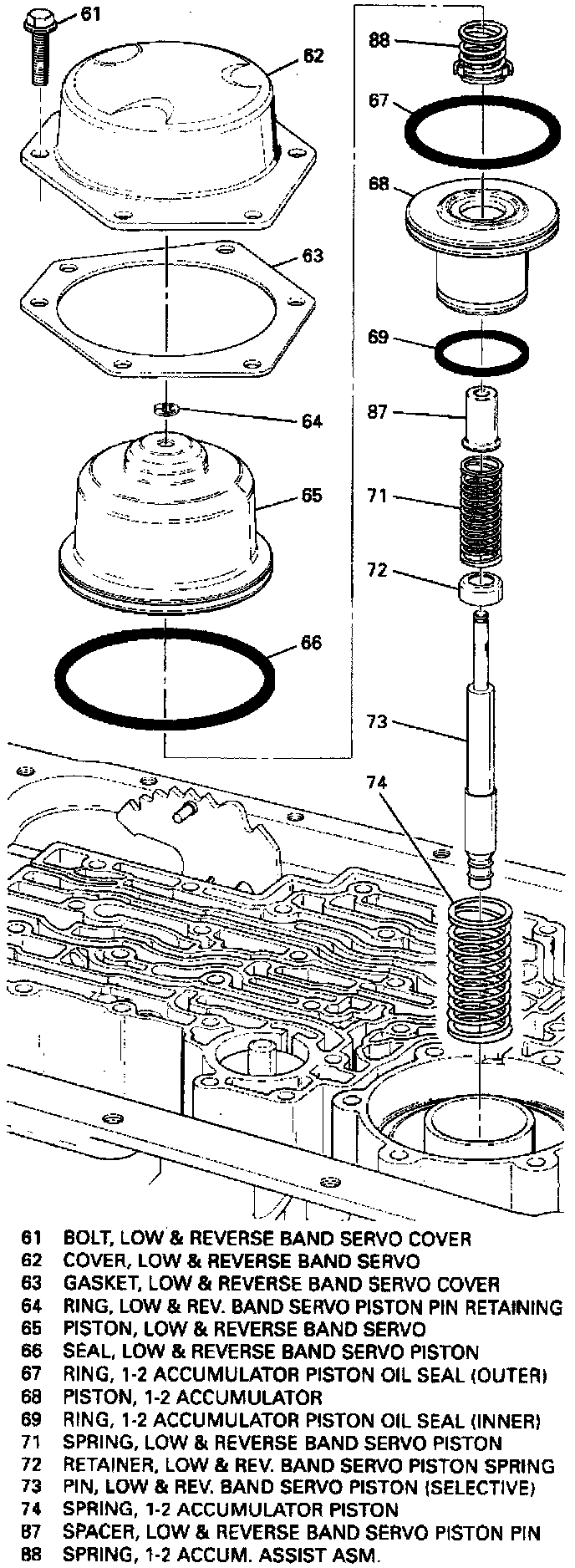16. Remove rear servo cover and gasket, then rear servo/accumulator assembly, per figure.
