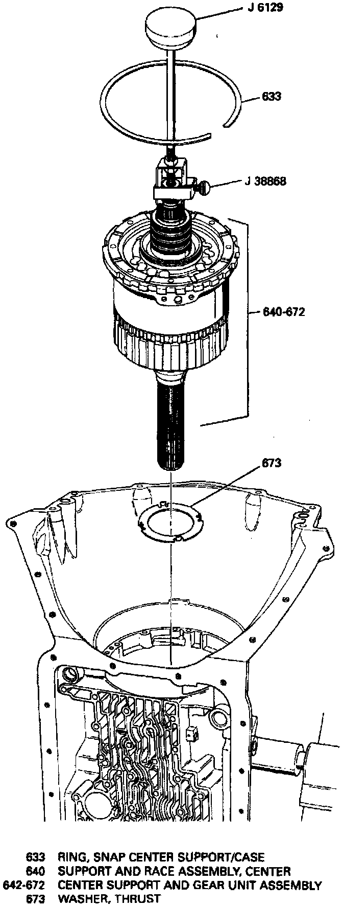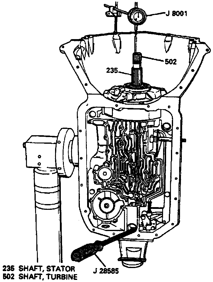 b. Eliminate slack by pressing down on turbine shaft and with pry bar tool No. J-28585 or equivalent press up on output carrier, then pull up with 3-5 lbs. of force on turbine shaft to eliminate any clearance between snap ring and overdrive carrier.