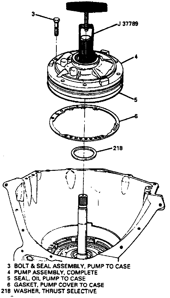 27. Remove seven pump mounting bolts and attach puller tool No. J-37789 or equivalent, then remove pump assembly from transmission.