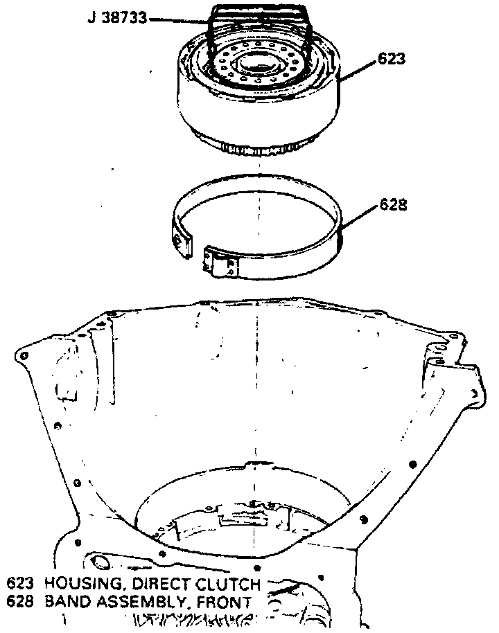 36. Remove direct clutch housing assembly using tool J-38733 or equivalent, per figure, then remove front band.