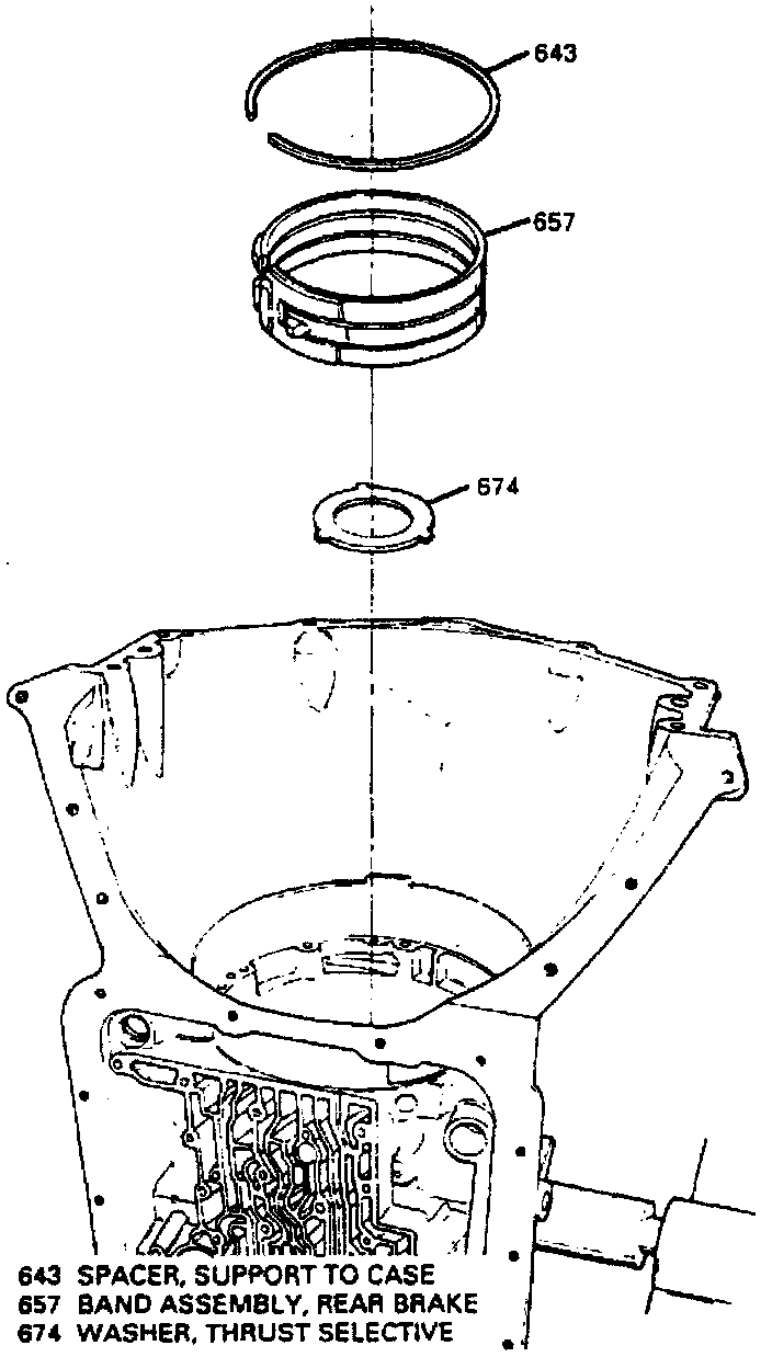 42. Remove rear band, thrust washer and selective thrust washers. Thrust washers may be stuck to output shaft and gear unit or bottom of case.
