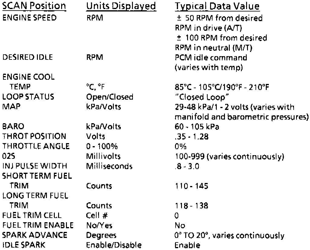 The Tech 1 scan data listed in these tables may be used for comparison after completing the "On-Board Diagnostic (OBD) System Check" and finding the on-board diagnostics functioning properly with no Diagnostic Trouble Codes [DTC(s)] displayed. The "Typical Tech 1 Data Values" are an average of display values recorded from normally operating vehicles and are intended to represent what a normally functioning system would display. The values you get may vary due to low battery charge or other reasons, but they should be very close.A SCAN TOOL THAT DISPLAYS FAULTY DATA SHOULD NOT BE USED, AND THE PROBLEM SHOULD BE REPORTED TO THE MANUFACTURER. THE USE OF A FAULTY SCAN TOOL CAN RESULT IN MISDIAGNOSIS AND UNNECESSARY PARTS REPLACEMENT.