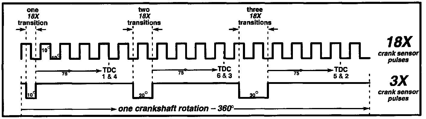 The ignition control module determines crankshaft position for correct ignition coil sequencing by counting how many 18X signal transitions occur, i.e.; "ON-OFF" or "OFF-ON," during a 3X pulse.