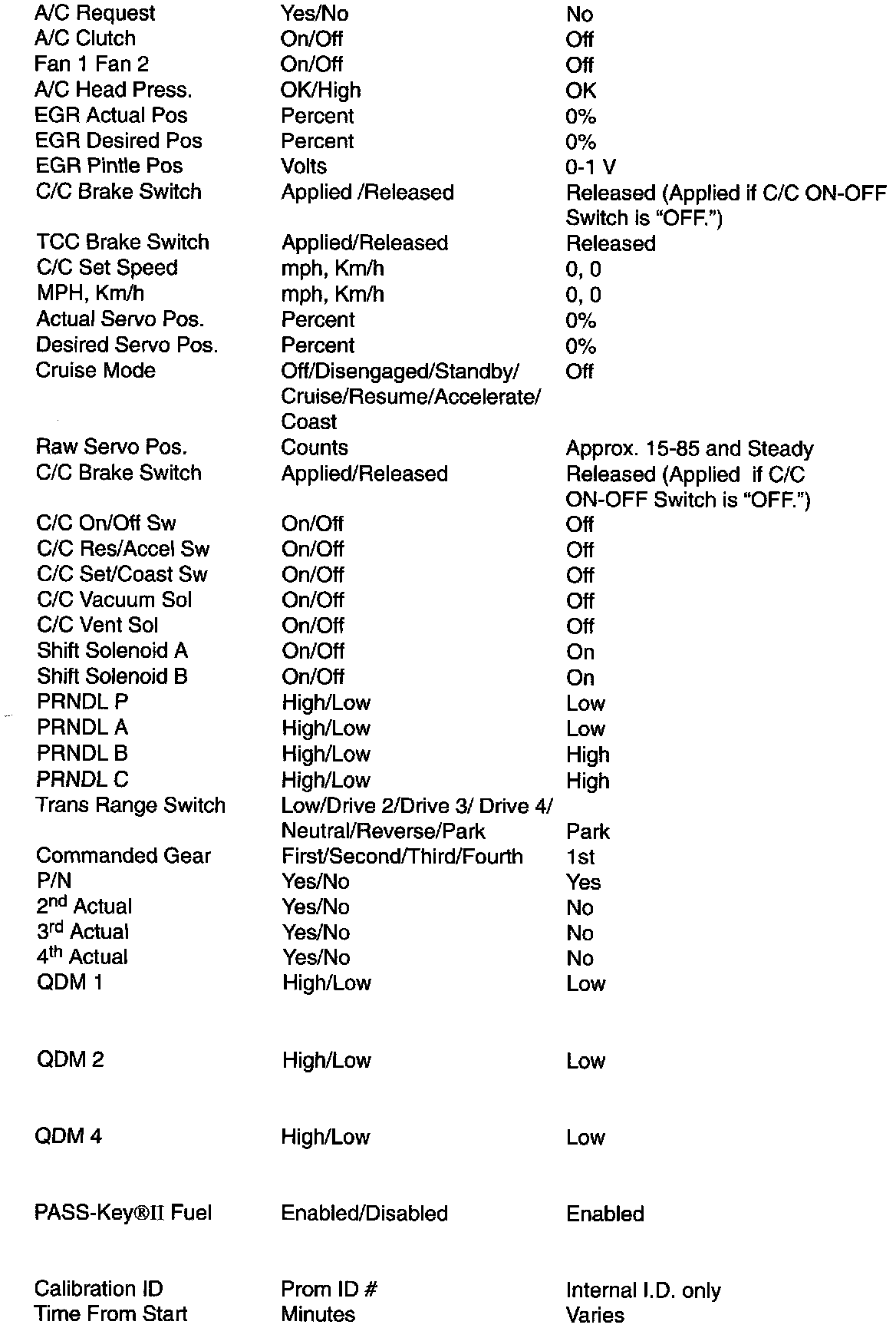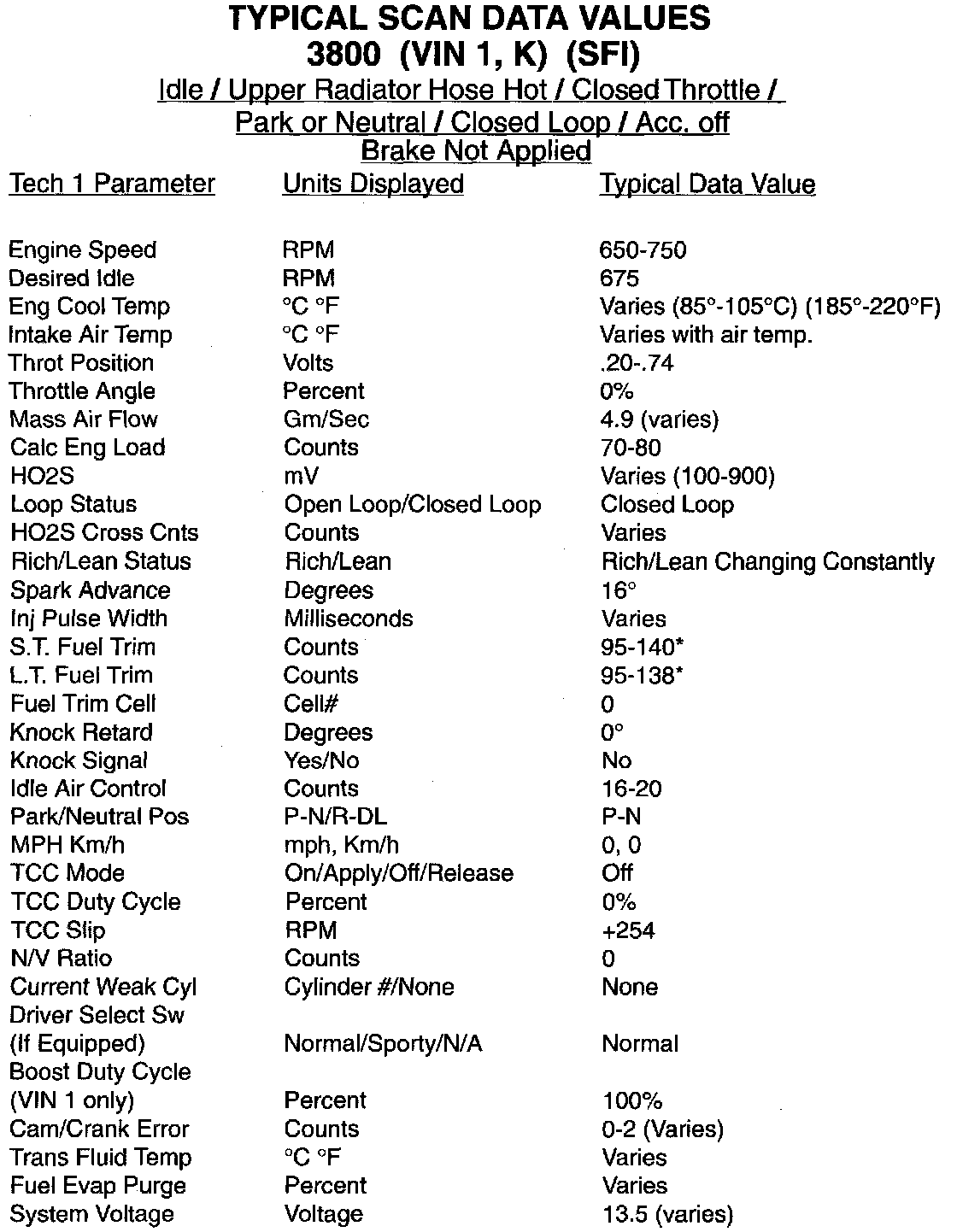 Only the parameters listed below are used in this manual for diagnosis. If a scan tool reads other parameters, the values are not recommended by General Motors for use in diagnosis.