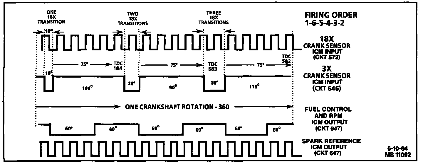 ^ Sends a crankshaft reference signal to the PCM. The PCM determines engine rpm from this signal. It is also used by the PCM to determine crankshaft position for IC spark advance calculations. (The falling edge of each fuel control signal pulse occurs 70° before TDC of any cylinder.) The fuel control signal sent to the PCM by the ignition control module is an "ON-OFF" pulse occurring 3 times per crankshaft revolution. This is neither the 3X nor the 18X crank sensor pulse, but both of these are required before the ignition control module will generate the fuel control signal.