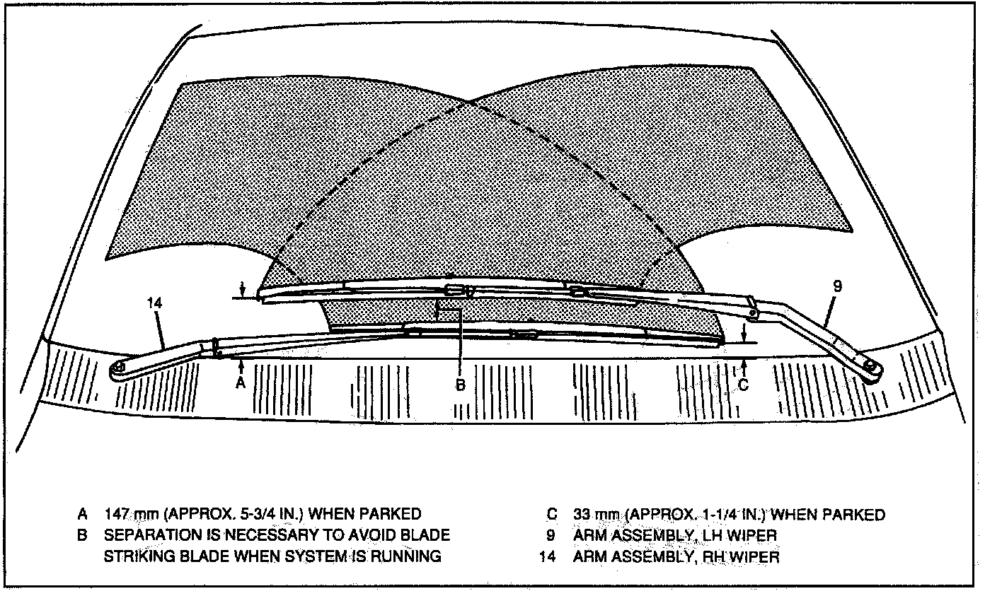 ^ To install right-hand wiper arm assembly (14), measure from tip of blade assembly to bottom edge of glass. This must be 33 mm (approx. 1-1/4 in.).