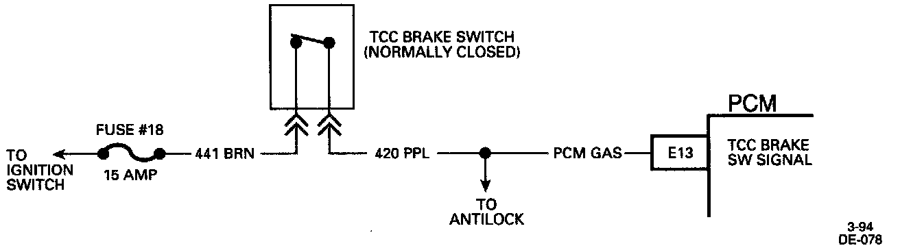 The normally closed brake switch supplies a B+ signal on CKT 420 to the Powertrain Control Module (PCM). The signal voltage is opened when the brakes are applied.