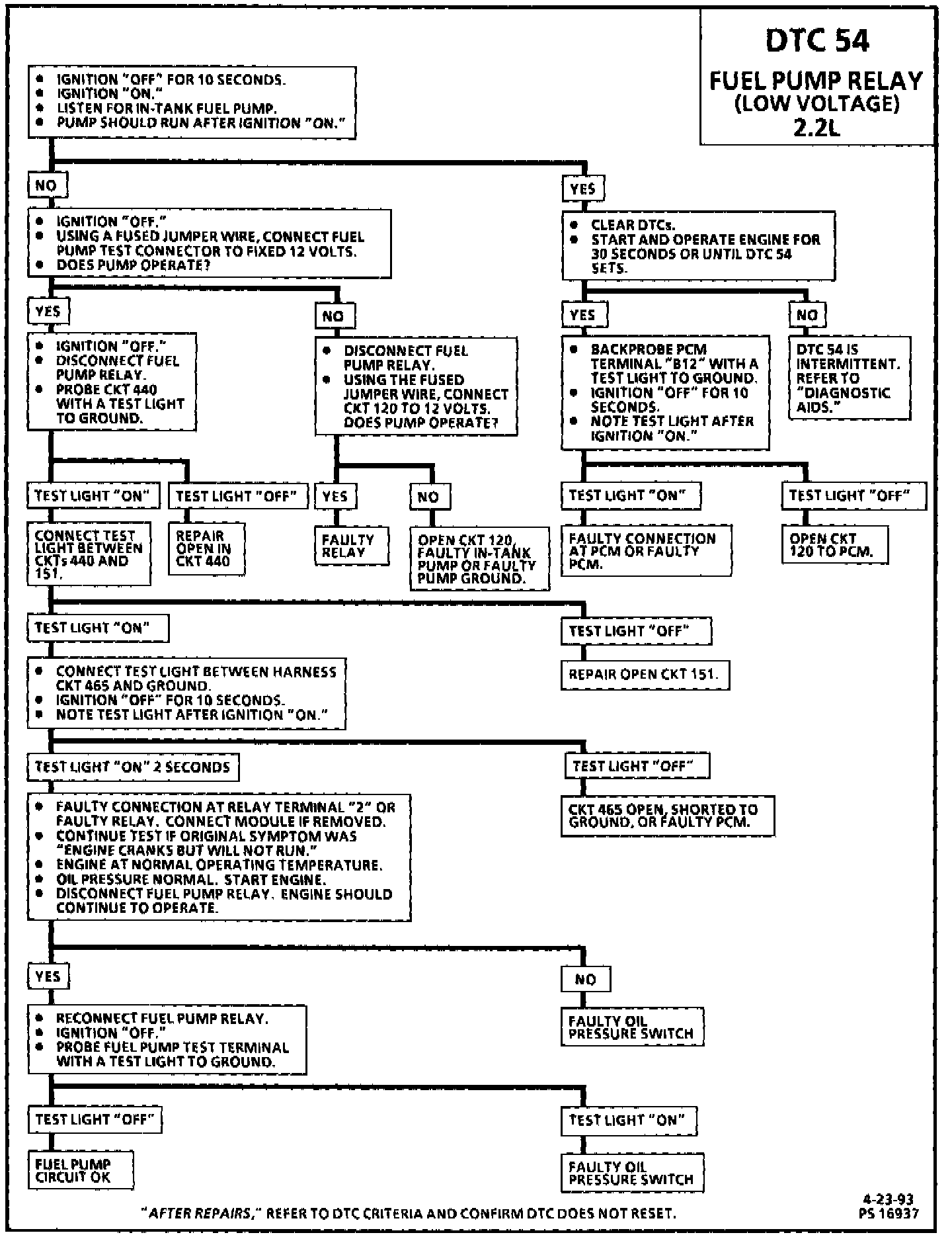 DTC 54 will set if the voltage at terminal "B12" is less than 2 volts for 1.5 seconds since the last reference pulse was received. This DTC is designed to detect a faulty relay, causing extended crank time, and the DTC will help the diagnosis of an engine that "Cranks But Will Not Run."