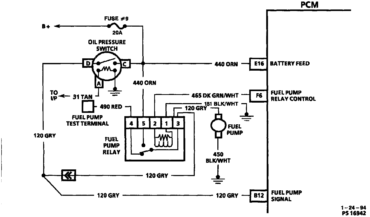 The status of the fuel pump CKT 120 is monitored by the PCM at terminal "B12" and is used to compensate fuel delivery based on system voltage. This signal is also used to store a DTC if the fuel pump relay is defective or fuel pump voltage is lost while the engine is running. There should be about 12 volts on CKT 120 for at least 2 seconds after the ignition is turned "ON," or any time reference pulses are being received by the PCM.