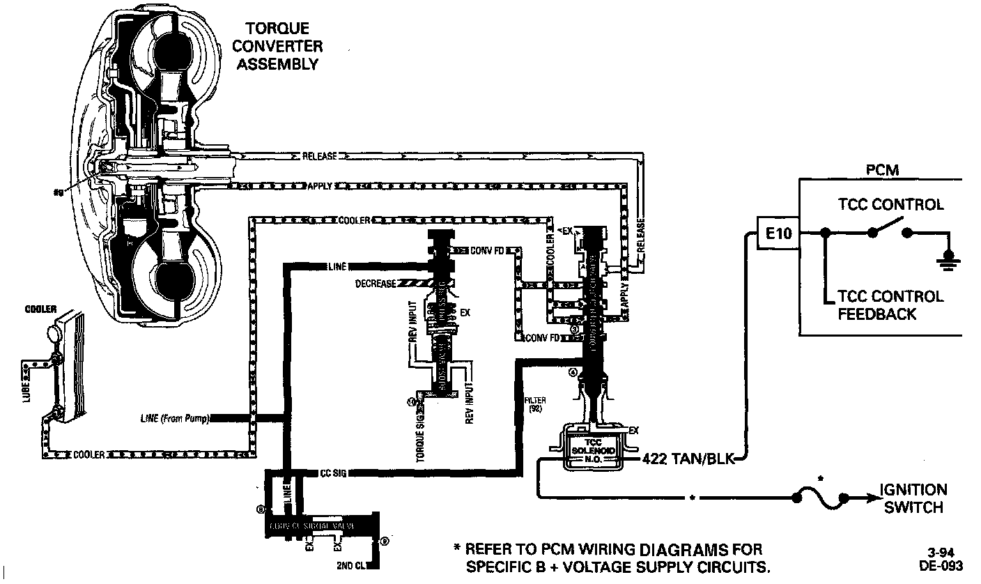 The Powertrain Control Module (PCM) energizes the Torque Converter Clutch (TCC) solenoid by grounding CKT 422 with an internal quad-driver. The TCC solenoid allows converter release fluid to exhaust past the #9 checkball, applying the TCC. The TCC solenoid will de-energize when the quad-driver no longer provides a ground. When the TCC solenoid is de-energized will block exhaust fluid, and release the TCC.