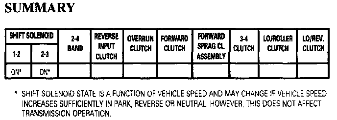 Note: In Park, Reverse, and Neutral the shift solenoids are shown energized. This is the normal operating state when the vehicle is stationary or at low vehicle speeds. However, the PCM will change the shift solenoid states depending on vehicle speed. For example, if Neutral is selected when the transmission is operating in Second Gear, the shift solenoids will remain in a Second Gear state. However, with the manual valve blocking line pressure, the shift solenoid states do not affect transmission operation in Park, Reverse and Neutral.