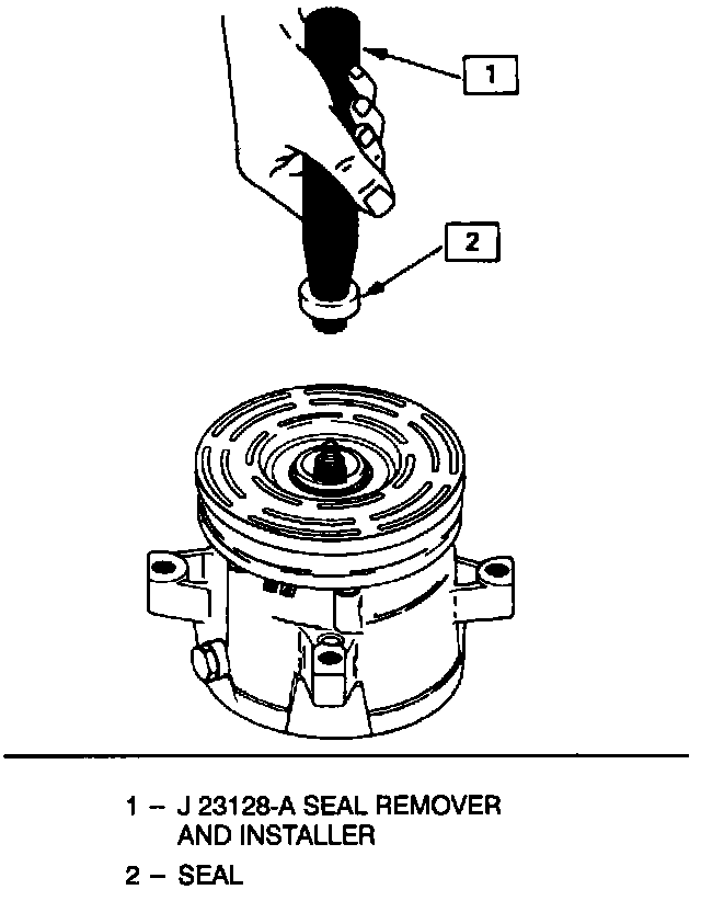 6. Fully engage the knurled tangs of seal remover-installer J 23128-A into the recessed portion of the seal by turning the handle clockwise. Remove the seal from the compressor with a rotary-pulling motion. Discard the seal. The handle should be hand-tightened securely. Do not use a wrench or pliers.