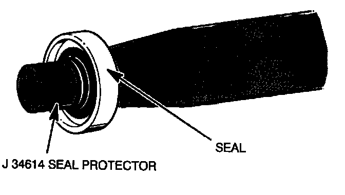 3. Dip the new seal in clean 525 viscosity refrigerant oil and assemble seal to Seal Installer J 23128-A, by turning handle clockwise. The stamped steel case side of the lip seal must be engaged with knurled tangs of installer so that flared-out side of lip seal is facing and installed towards the compressor. Install shaft seal protector 334614 on the lip seal, illustration. Place the seal protector J 34614 over end of compressor shaft, and slide the new seal onto the shaft with a rotary motion until it stops. Take care not to dislodge the O-ring. Be sure the seal makes good contact with the O-ring. Disengage the installer from the seal and remove the installer J 23128-A and the shaft seal protector J 34614.