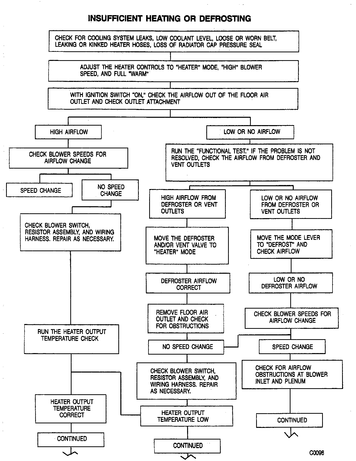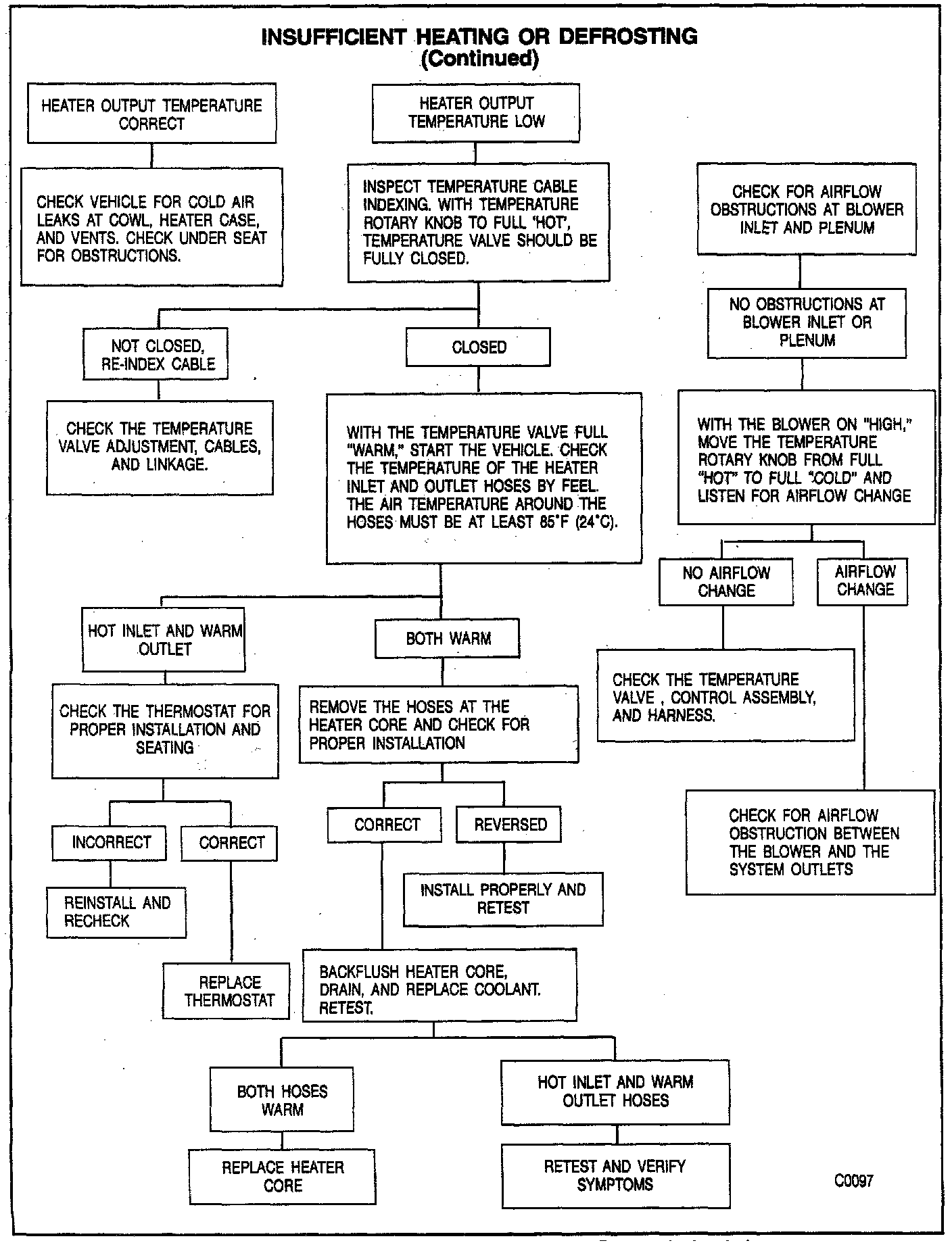 The most likely causes of insufficient heating outside the heater system include a low coolant level, faulty thermostat, partially or fully clogged heater core or hose, obstruction to air circulation, or an air leak past a faulty seal into the passenger compartment. For an organized diagnosis procedure, (refer to accompanying figures).