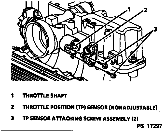 The hardware used to attach the Throttle Position (TP) sensor is coated with thread-locking adhesive. If any these parts are removed for service, inspect the attaching screw threads. There should be enough thread-locking material (adhesive or compound) on the threads to ensure proper relocking. If not, clean the threads and apply Loctite 262, or equivalent, to the threads before reassembly. Replacement screws are included in the service screw assortment package. New attaching hardware is included in the service packages.