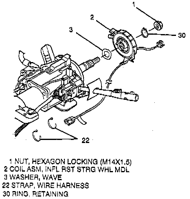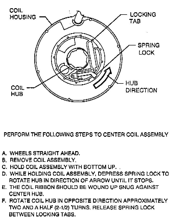 2) Centering spring is pushed down, letting hub rotate while coil (2) is removed from steering column. (If this occurs, center coil)