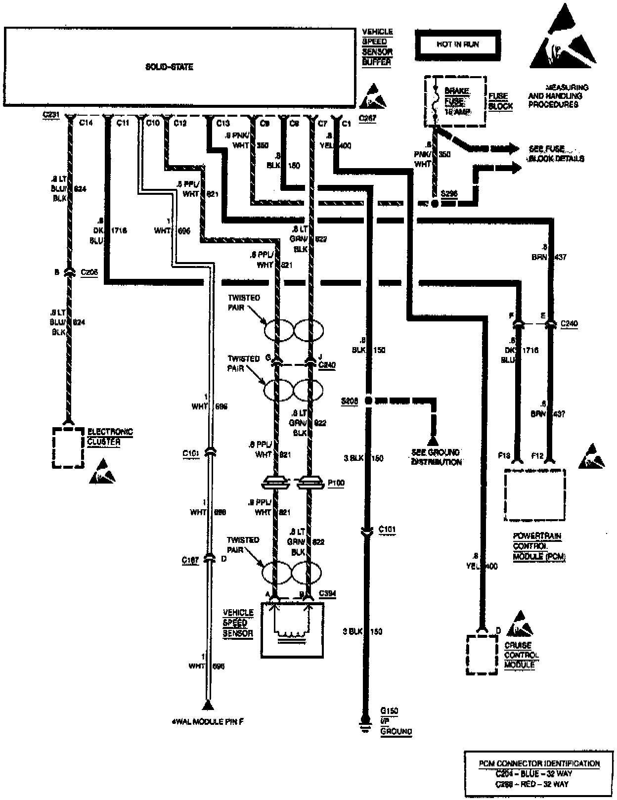 To perform these functions, the buffer is given a five volt signal from the vehicle's PCM on two circuits, 437 and 1697. Circuit 437 is used by the transmission shift points. Circuit 1697 is used by the PCM to determine road speed for uses such as vehicle overspeed fuel cutoff and idle air control valve position (figure one).