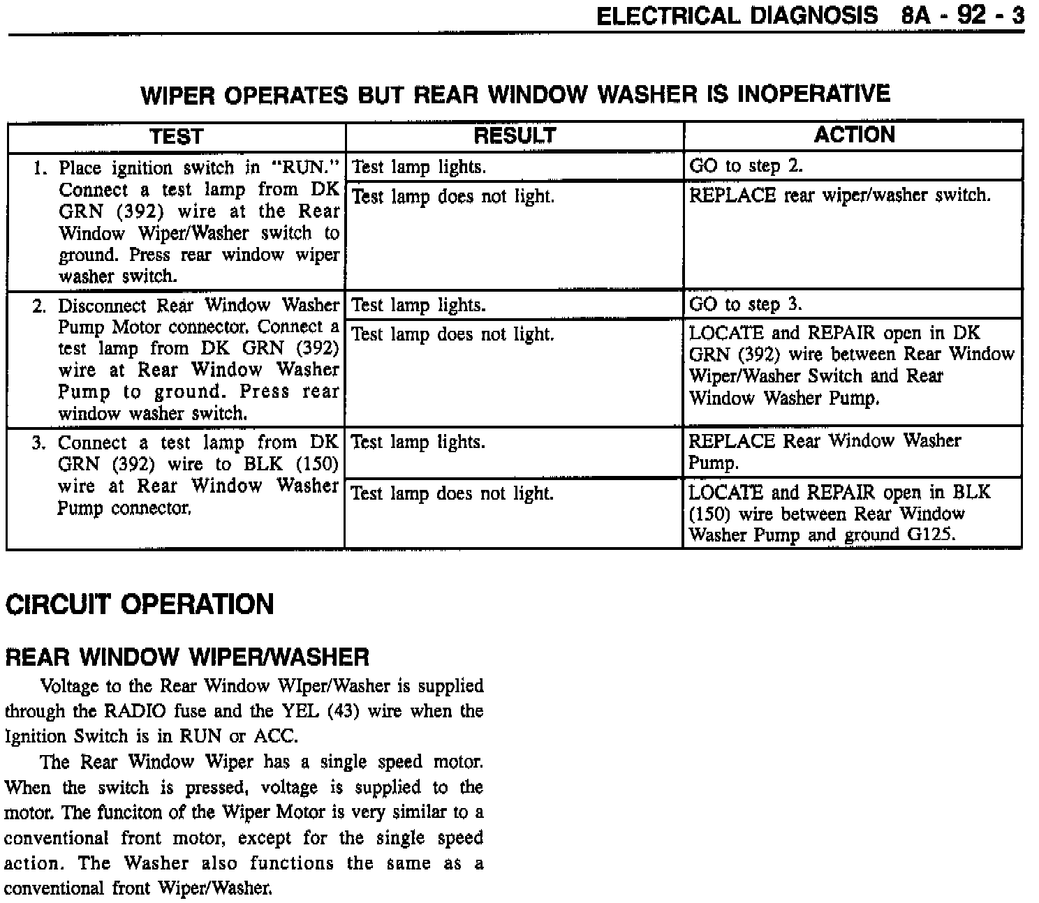 This bulletin revises Section 8A-92, Rear Wiper/Washer to include diagnosis information in the 1995 S/T Service Manual. This bulletin replaces pages 8A-92-2 and 8A-92-3.