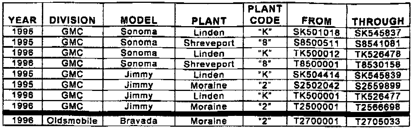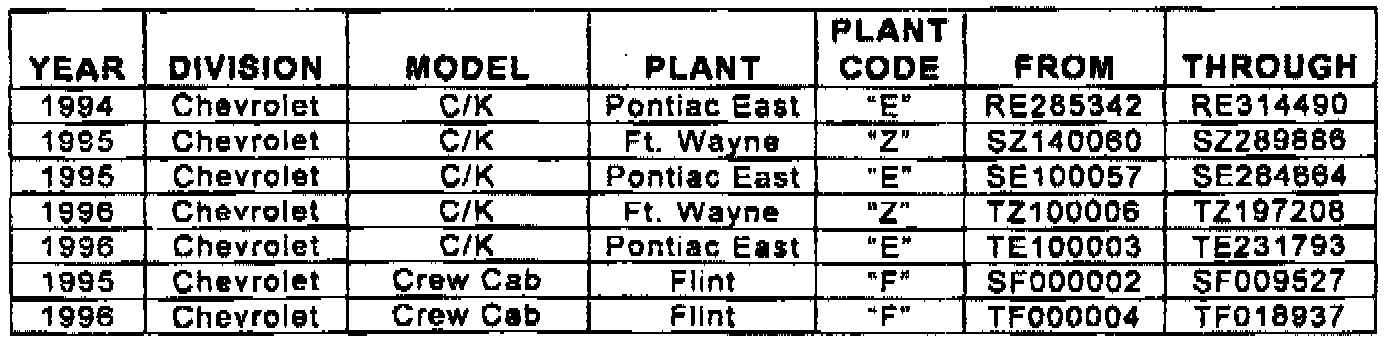 Involved are certain 1994-96 Chevrolet and GMC C/K model vehicles, and 1995-96 Chevrolet, GMC, and Oldsmobile S/T model vehicles built within the VIN breakpoints as shown.