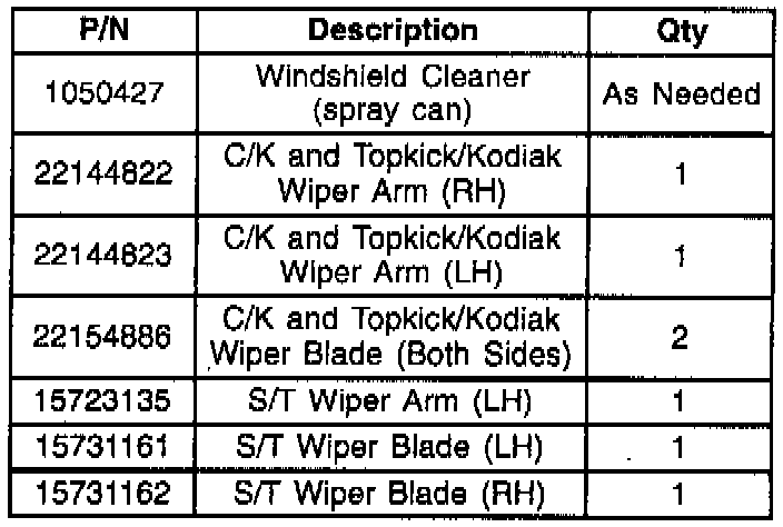 2. Install the redesigned wiper arms with the enhanced wipe angle according to Section 8E1 of the Service Manual (Wiper Arm Assembly Replacement). (Driver's side P/N: 22144823; Passenger's side P/N: 22144822)