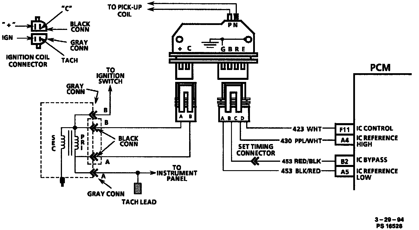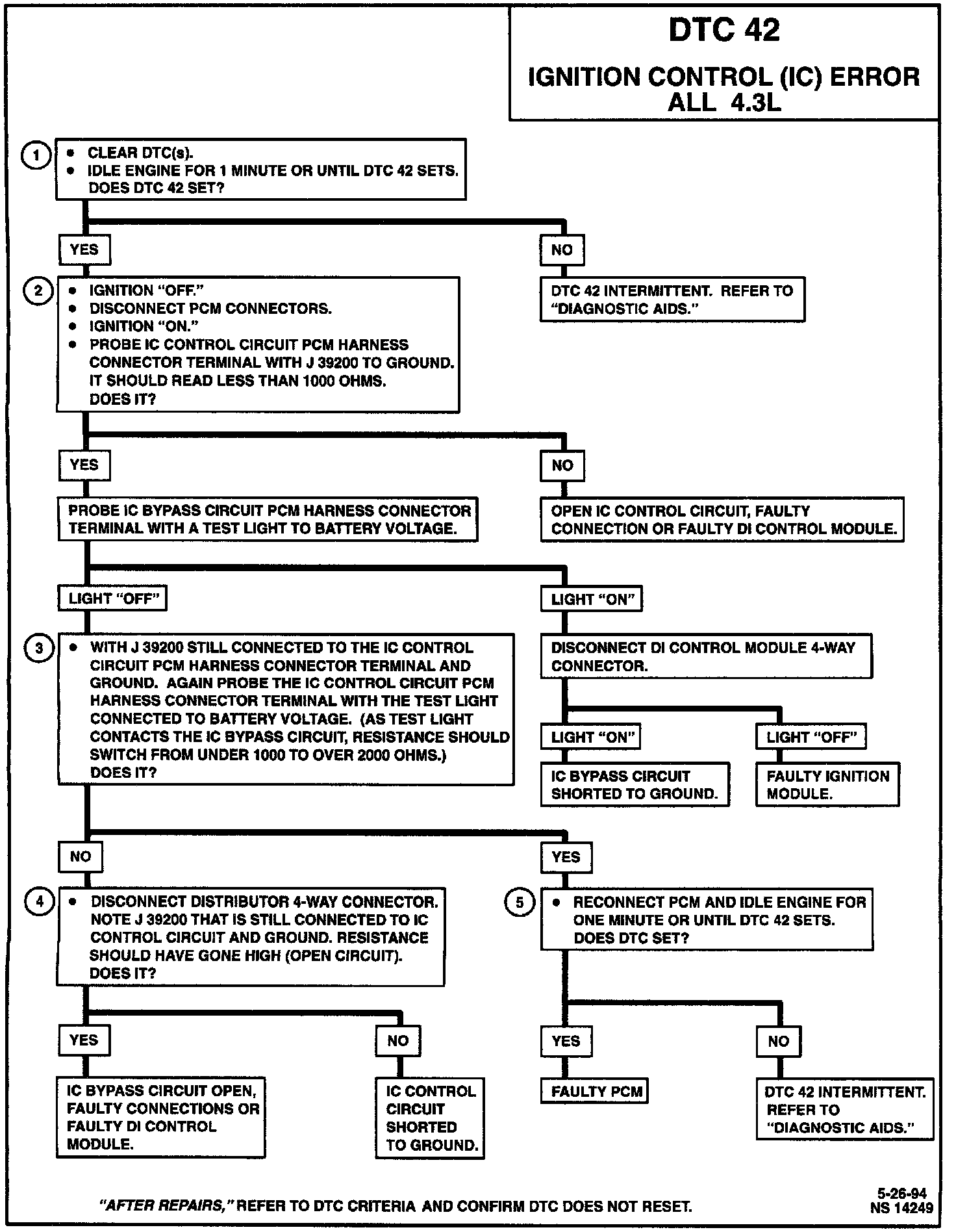 When the system is running on the ignition module, that is, no voltage on the bypass line, the ignition module grounds the Ignition Control (IC) signal. The PCM expects to see no voltage on the IC line during this condition. If it sees a voltage, it sets DTC 42 and will not go into the IC mode.