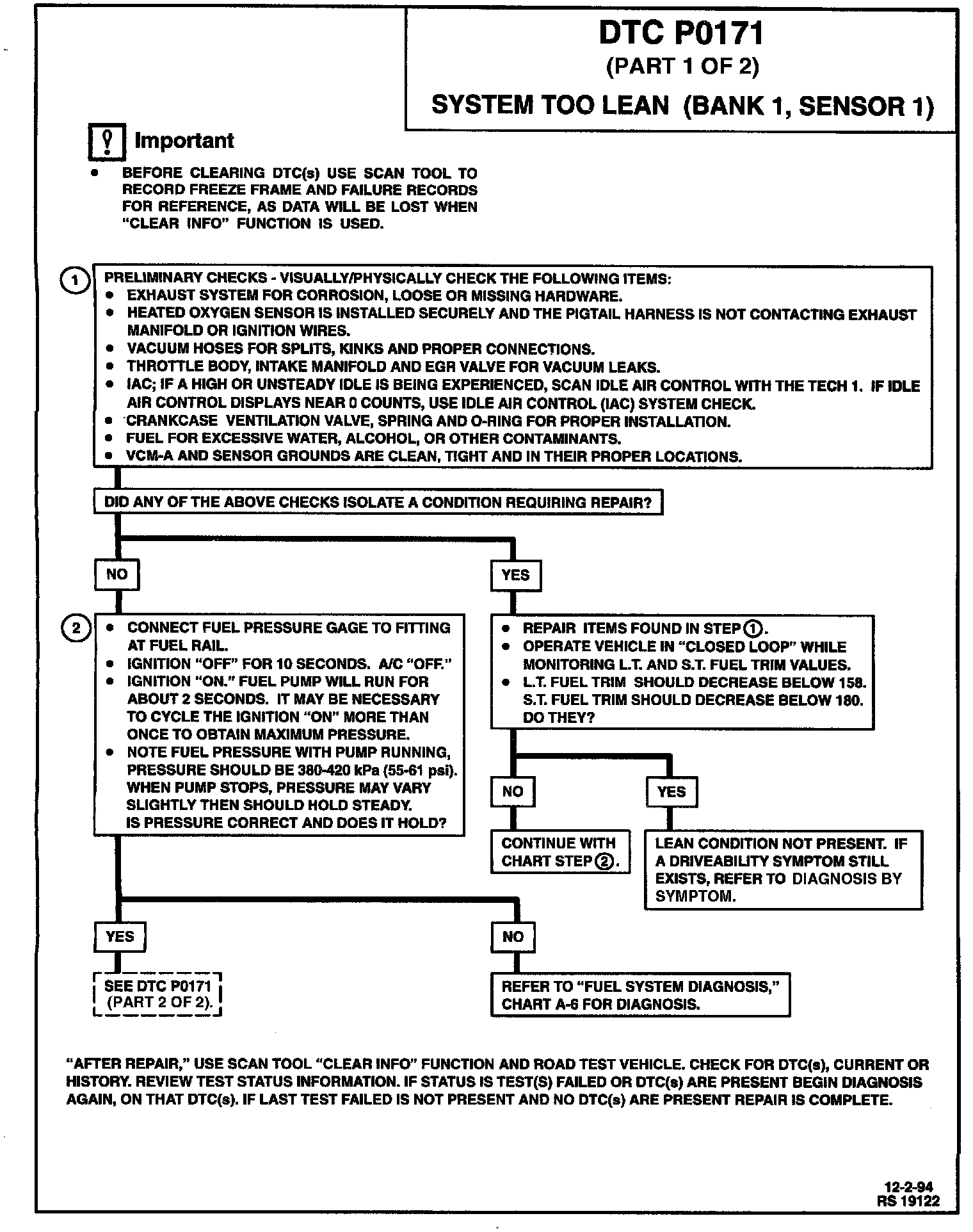 If the problem cannot be isolated using the diagnostic charts, try monitoring Long Term (L.T.) fuel trim and fuel trim cell while operating the vehicle under various loads. This may isolate the condition which caused DTC P0171 to be set.