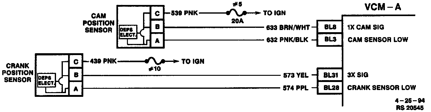 Misfire is detected using the crankshaft position sensor and camshaft position sensor. The speed of the crankshaft is monitored by the Vehicle Control Module-A (VCM-A) which has the ability to detect deceleration of the crankshaft that are not associated with normal engine speed reduction. To determine if a misfire occurred, the deceleration information is compared to engine speed and engine load. If a misfire event is determined, the crankshaft position is compared to the cam sensor signal in order to determine which cylinder misfired. This information will be stored in separate accumulators for each cylinder. Upon completion (or failure) of the test, the VCM-A will evaluate the number of misfires in each accumulator. If the accumulators are somewhat even or if three or more cylinders are misfiring, then this determines that a random misfire has occurred. The VCM-A also utilizes input from the Antilock Brake System (ABS) wheel speed sensor in order to determine if a rough road condition exists which could cause crankshaft acceleration and deceleration. If a rough road condition exists, the diagnostic will not run. DTC P0300 is a type "B" DTC.