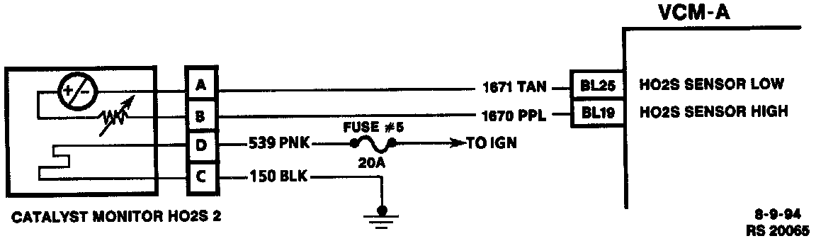 In order to control emissions of Hydrocarbons (HC), Carbon Monoxide (CO) and Oxides of Nitrogen (NOx), a three-way catalytic converter is used. The catalyst within the converter promotes a chemical reaction which oxidizes the HC and CO present in the exhaust gas, converting them into harmless water vapor and carbon dioxide. The catalyst also reduces NOx, converting it to nitrogen. The Vehicle Control Module-A (VCM-A) has the capability to monitor this process using Heated Oxygen Sensor (HO2S) 2. HO2S 2, located in the exhaust stream past the three-way catalytic converter, produces - an output signal which indicates the oxygen storage capacity of the catalyst; this in turn indicates the catalyst's ability to convert exhaust emissions effectively. If the catalyst is functioning correctly, the HO2S 2 signal will be far less active than that produced by HO2S 1. If a problem exists which causes the VCM-A to detect excessive HO2S 2 activity outside of an acceptable range for an extended period of time, the VCM-A will set DTC P0420, indicating that the three-way catalytic converter's oxygen storage capacity is below a threshold considered acceptable.