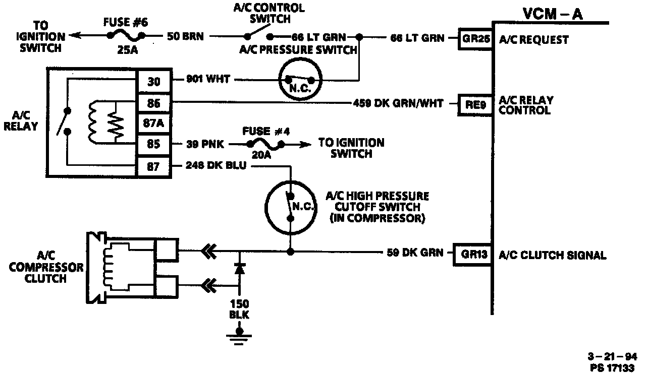 When the A/C control switch is turned "ON," voltage is supplied to the Vehicle Control Module-A (VCM-A) on CKT 66. If there is sufficient pressure in the A/C system and/or the ambient temperature is not too cold, the A/C pressure switch will close and supply voltage to the switch side of the A/C relay on CKT 901. After a calibrated delay time (approximately 20 sec), the VCM-A will ground CKT 459, enabling the relay and applying voltage to CKT 248. The normally closed A/C high pressure cutoff switch will provide voltage to CKT 59 and enable the A/C clutch. Voltage is also supplied to the VCM-A on CKT 59. This voltage signal allows the VCM-A to make idle, timing and fuel corrections for smoother clutch engagements.