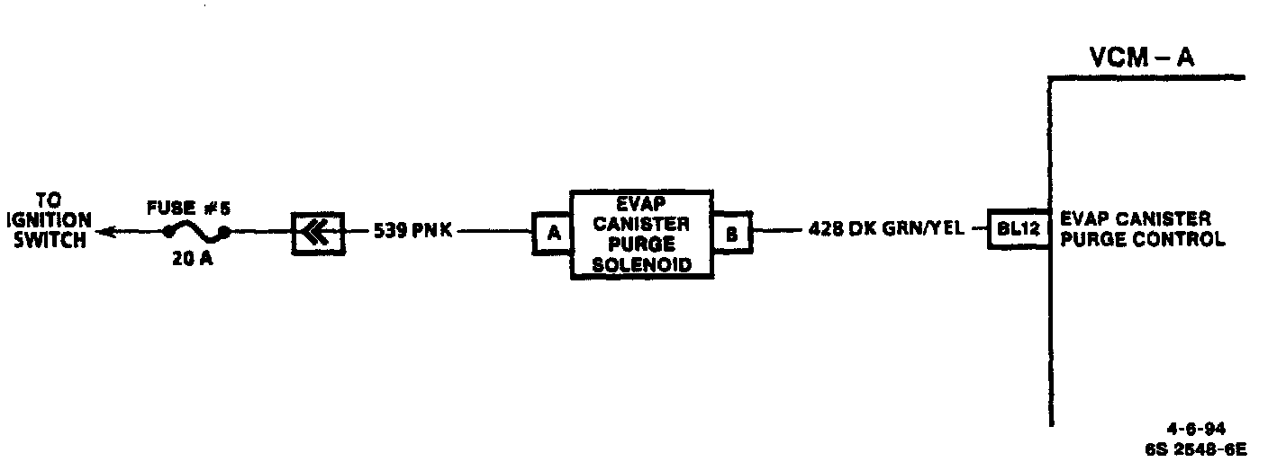 B+ is applied to the EVAP Canister Purge Solenoid when the ignition key is turned "ON." Once the engine coolant has reached normal operating temperature, the control module grounds the EVAP Canister Purge Control circuit. The purge solenoid will open, allowing the fuel vapors from the vapor canister to be directed to the intake manifold.